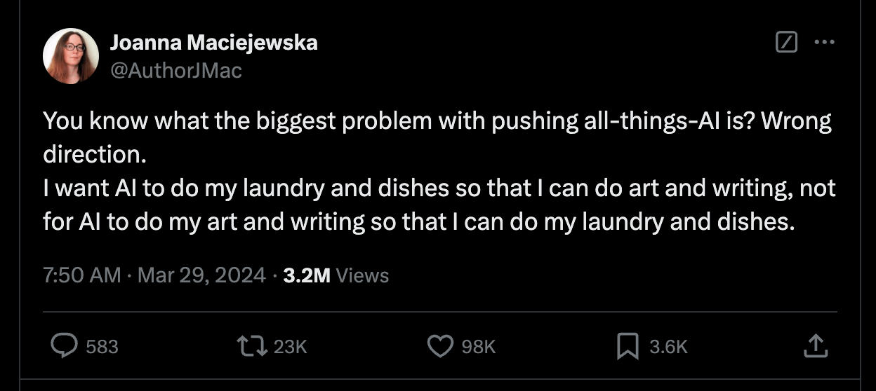 "You know what the biggest problem with pushing all-things-AI is? Wrong direction. I want AI to do my laundry and dishes so that I can do art and writing, not for AI to do my art and writing so that I can do my laundry and dishes."